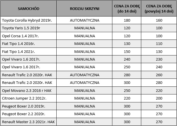 W celu wynajmu samochodu wymagamy wcześniejszej rezerwacji telefonicznej, mailowej lub przez Facebook.